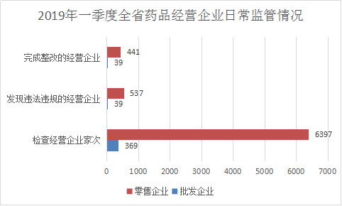 2019年一季度,全省共检查药品经营企业6766家次,发现违法违规的经营企业576家次,完成整改的经营企业480家次,立案查处企业65家次。