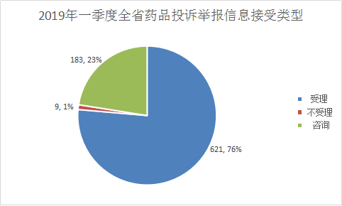 2019年一季度末,全省药品接受各类投诉举报信息共813件,占全省接受“两品一械”投诉举报信息总数的68.6%。