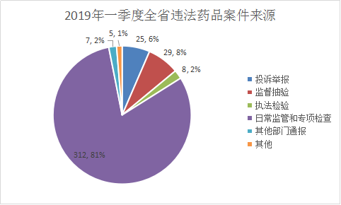 2019年一季度,全省查处违法药品案件386件,主要来源于日常监管和专项检查312件,占全省查处药品案件总数的81%。查处结果方面,责令停产停业1户,移送司法机关案件5件。