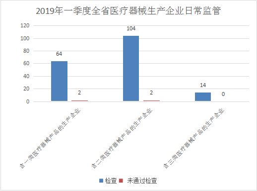 2019年一季度,全省共检查医疗器械生产企业177家次,存在违法违规的生产企业1家次,完成整改的企业5家次。检查国家重点企业1家次,省重点企业5家次。全面检查高风险企业无菌医疗器械生产企业18家,均通过检查;检查植入性医疗器械生产企业15家,均通过检查;检查第三类医疗器械的生产企业11家,均通过检查。