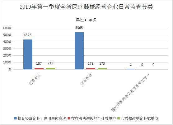 2019年一季度,全省检查医疗器械经营、使用企业9692家次,存在违法违规的企业或单位366家次,完成整改的企业386家次,移交稽查部门4家次。