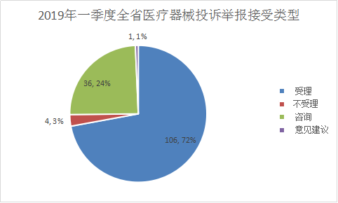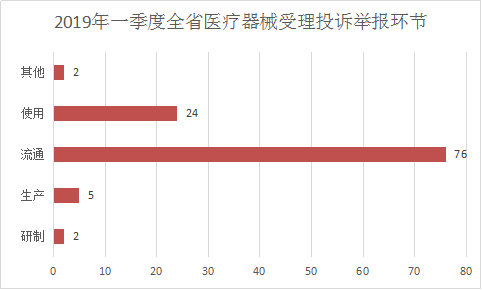 2019年一季度,全省医疗器械受理各类投诉举报106件,占全省受理投诉举报总数的11.5%。医疗器械受理投诉举报最多的环节在流通和使用,分别为流通环节受理76件,使用环节受理24件。全省医疗器械投诉举报办理情况:立案1件,结案4件,移送其他部门1件。