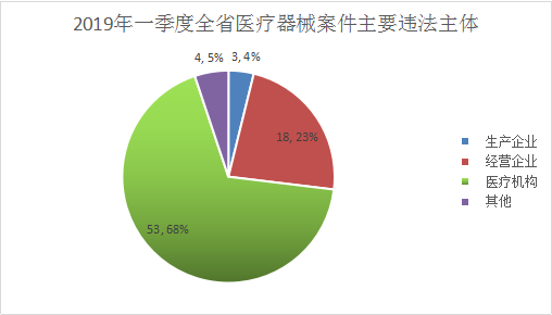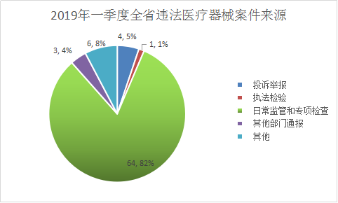 2019年一季度,全省查处违法医疗器械案件78件,主要来源于日常监管和专项检查64件,占医疗器械案件总数的82.1%。