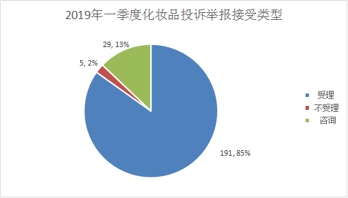 2019年一季度末,全省化妆品接受各类投诉举报信息共191件,占全省接受投诉举报信息总数的19%。