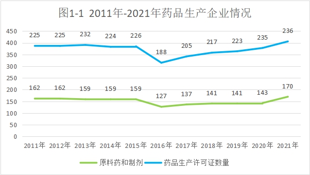2021年12月底,全省实有生产企业许可证236个,同比增长0.4%。其中,生产原料药和制剂的企业170个,同比增长26%。