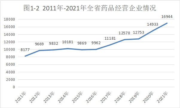 截至2021年12月底,全省实有药品经营企业16944家,同比增长13.5%。其中批发企业(含零售连锁总部)556家,药品经营零售企业16388家。